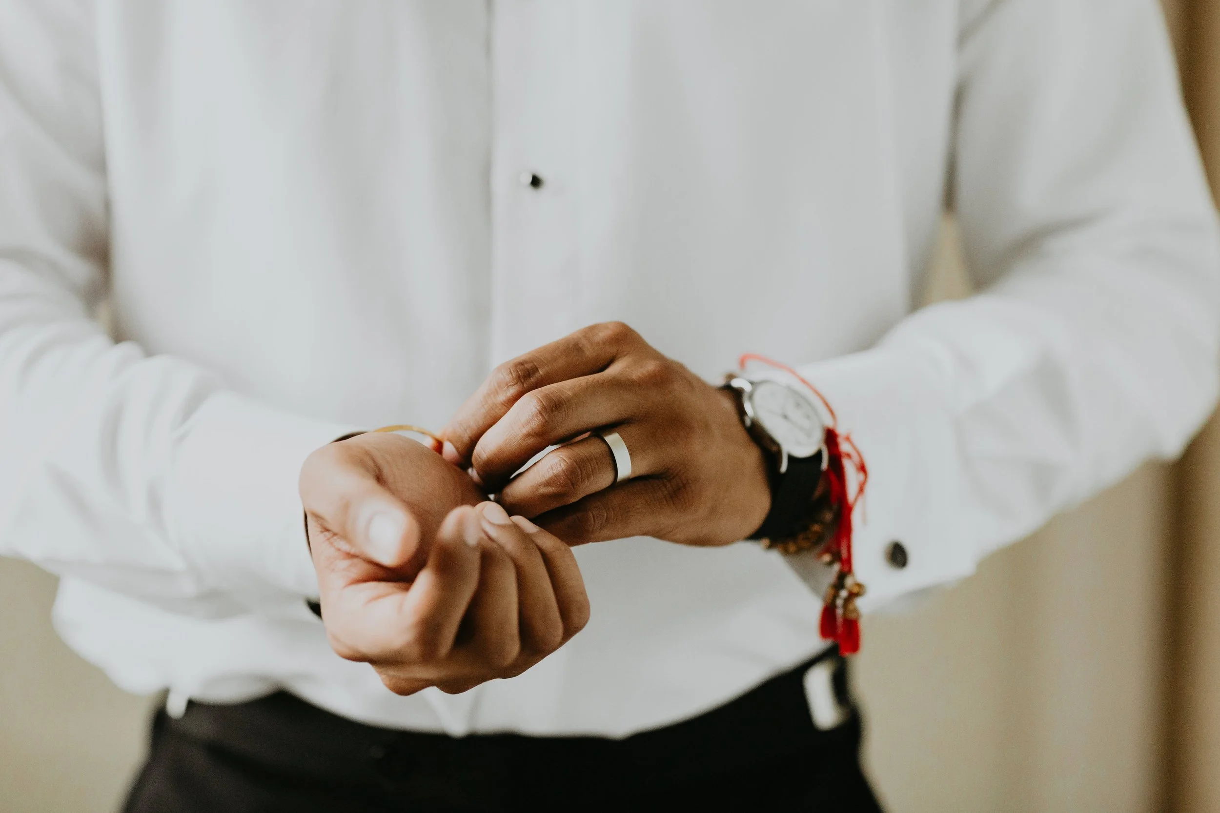 Person in a white dress shirt adjusting a silver ring on their finger, wearing a watch and red string bracelets.